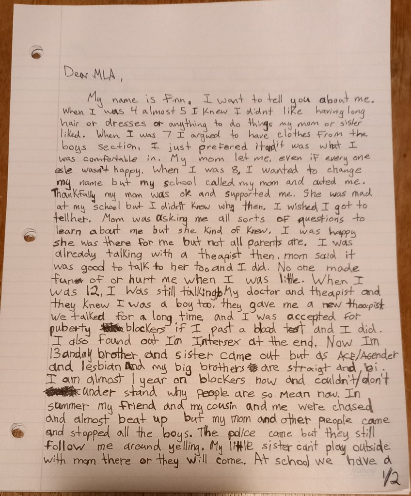 My name is Finn. I want to tell you about me. When I was 4 almost 5 I Knew I didnt like having long hair or dresses or anything to do things my mom or sister liked. When I was 7 I argued to have clothes From the boys section, I just prefered it and it was what I was comfortable in. My mom let me, even if every one esle wasn’t happy. When I was 8, I wanted to change my name but my school called my mom and outed me. Thankfully my mom was ok and supported me. She was mad school but I didn’t know why then. I wished I got to tellher. Mom was asking me all sorts of questions to learn about me but she kind of knew. I was happy she was there for me but not all parents are. I was already talking with a theapist then mom said it was good to talk to her too and I did. No one made fun of or hurt me when I was little. When I was 12, I was still talking to My doctor and therapist and they knew I was a boy too, they gave me a new therapist We talked for a long time and I was accepted for puberty blockers if I past a blood test and I did. I also found out I’m Intersex at the end. Now I’m 13 and my brother, and sister came out but as ACE / Agender and lesbian and my big brothers are straight and, bi. I am almost 1 year on blockers now and couldn’t/ don’t under stand why people are so mean now. In summer my friend and my cousin and me were chased and almost beat up but my mom and other people came and stopped all the boys. The police came but they still Follow me around yelling. My little sister can’t play outside with mom there or they will come. At school we have a non-binary bathroom but the bullies, who are meaner this year, destroyed the safe one and the mean kids wont let us in the other ones. The school isn’t going to fix it for us. now some of us are late to school or go at lunch to the mall to use the one there. I got in trouble for it but it hurt to hold all day. Kids like me shouldn’t have to live afraid or hurting just being ourselves.