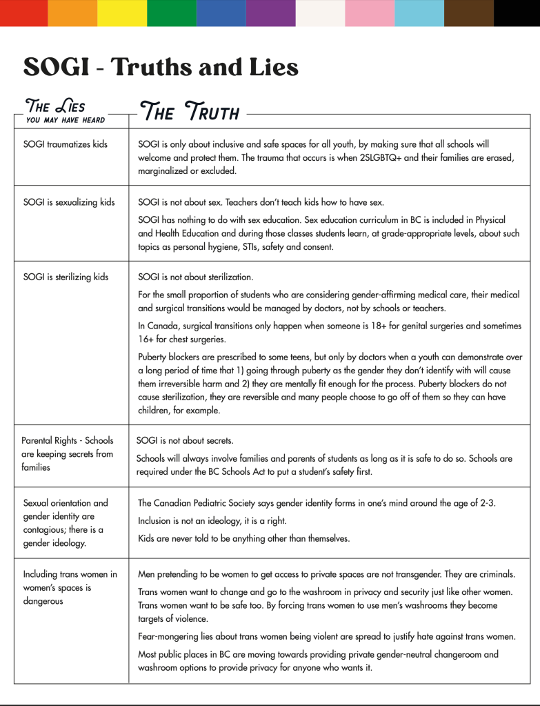 SOGI policies were implemented in all BC schools in 2017 to reflect the BC Human Rights Code which requires all public institutions to be 2SLGBTQ+ inclusive and eliminate discrimination.